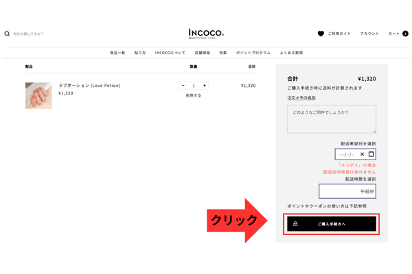カート画面にいき、「ご購入手続きへ」ボタンをクリック