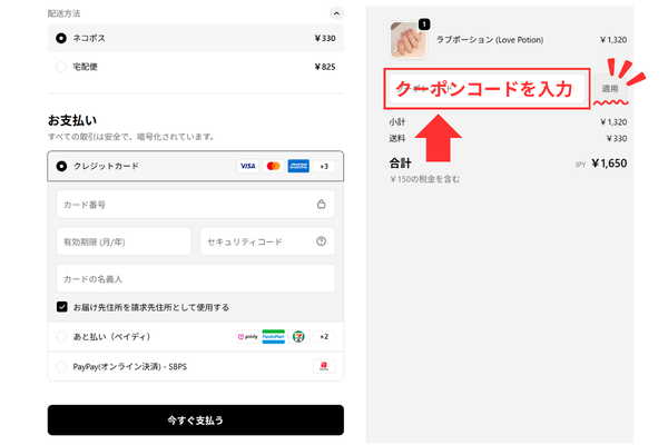 クーポンコード欄にクーポンコードを入力して、「適用」をクリック