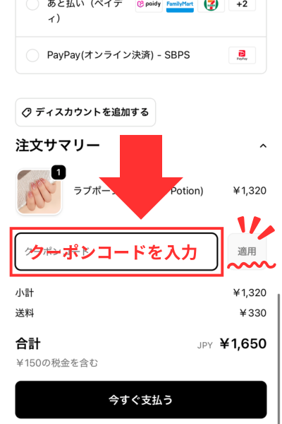 支払画面でクーポンコードが適用され、割引されているかを確認してから、支払処理を実施