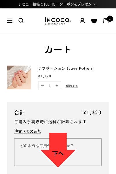 カート画面にいき、「ご購入の手続きへ」ボタンまで下にスクロール