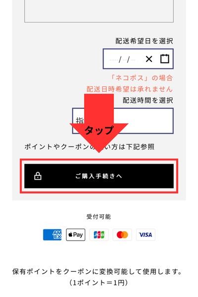 カート画面下の「ご購入の手続きへ」をタップ