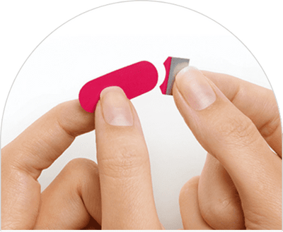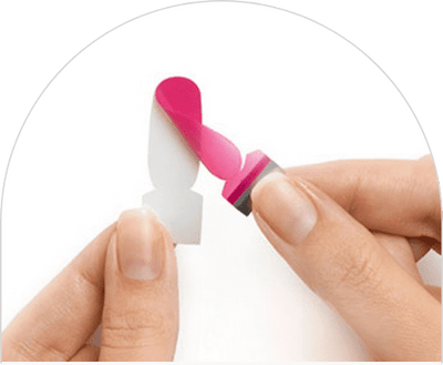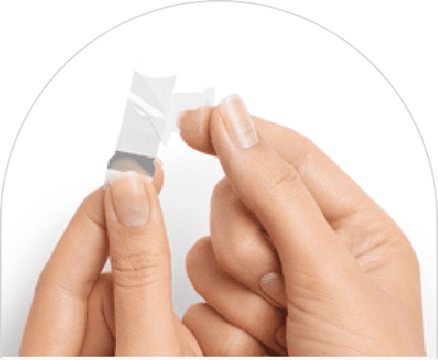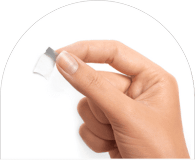 次に、カバーシートの中で、爪のサイズに合ったものを選んで切り離し、一番上の透明フィルムをゆっくり剥がします。そのあと、カバーシートも台紙から丁寧に剥がし、銀色の持ち手部分をそっと切り取ります。カバーシートは両端でカーブや幅が異なります。爪の形に合う方を選んで使用します。