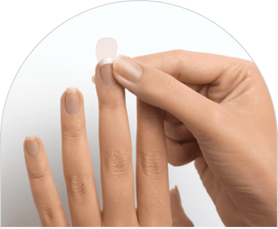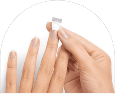 甘皮を避けて爪の根元にカバーシートの端を合わせ、しわを伸ばしながら貼ります。貼りなおす際は、ゆっくりと丁寧にはがします。爪先に向けて軽く引っ張るように伸ばして、指先でしっかりと密着させます。特にシートの端が浮いていないか確認し、しわがなくなるまでよく伸ばします。