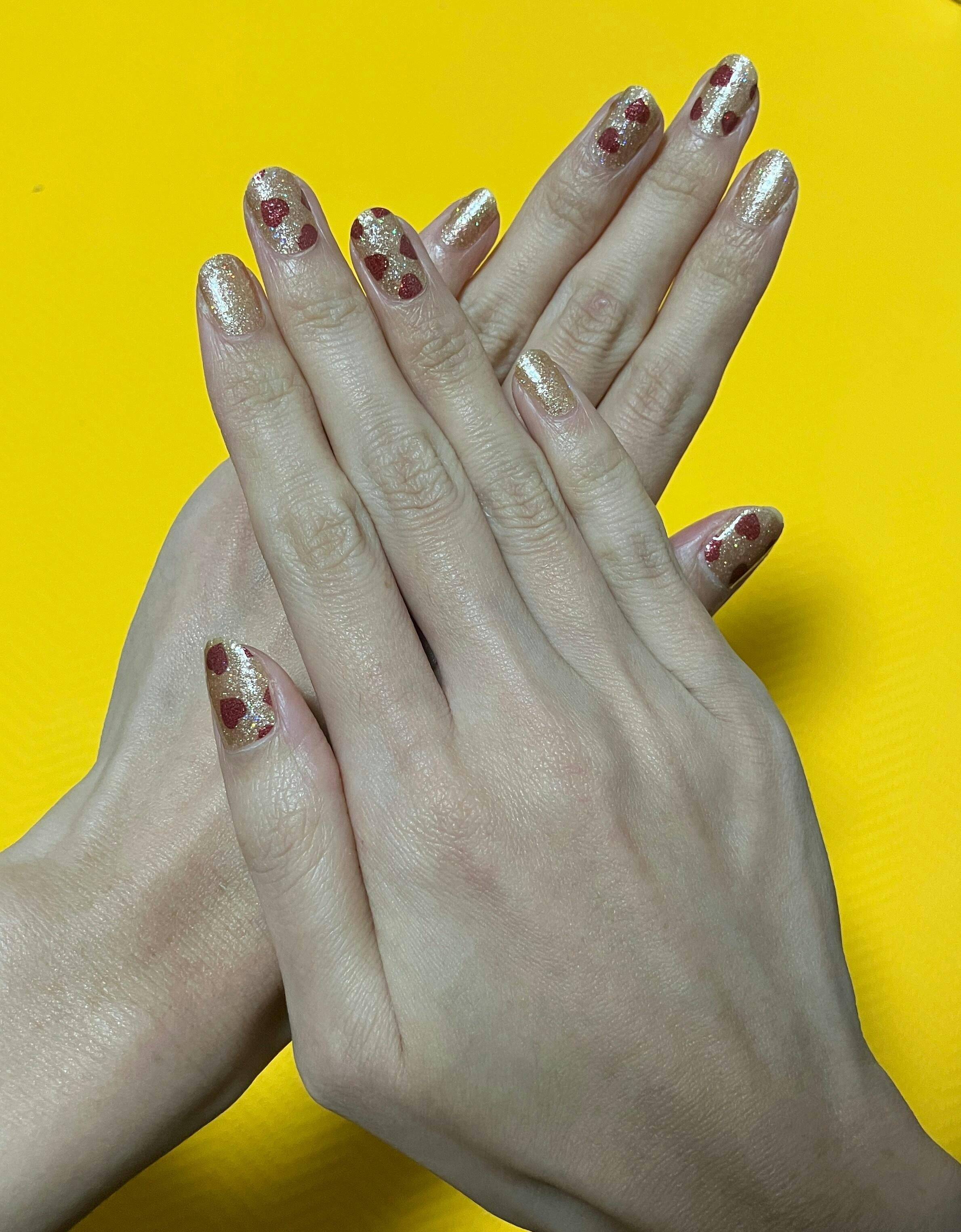温かみのあるゴールドグリッターにハートモチーフをあしらったデザイン。